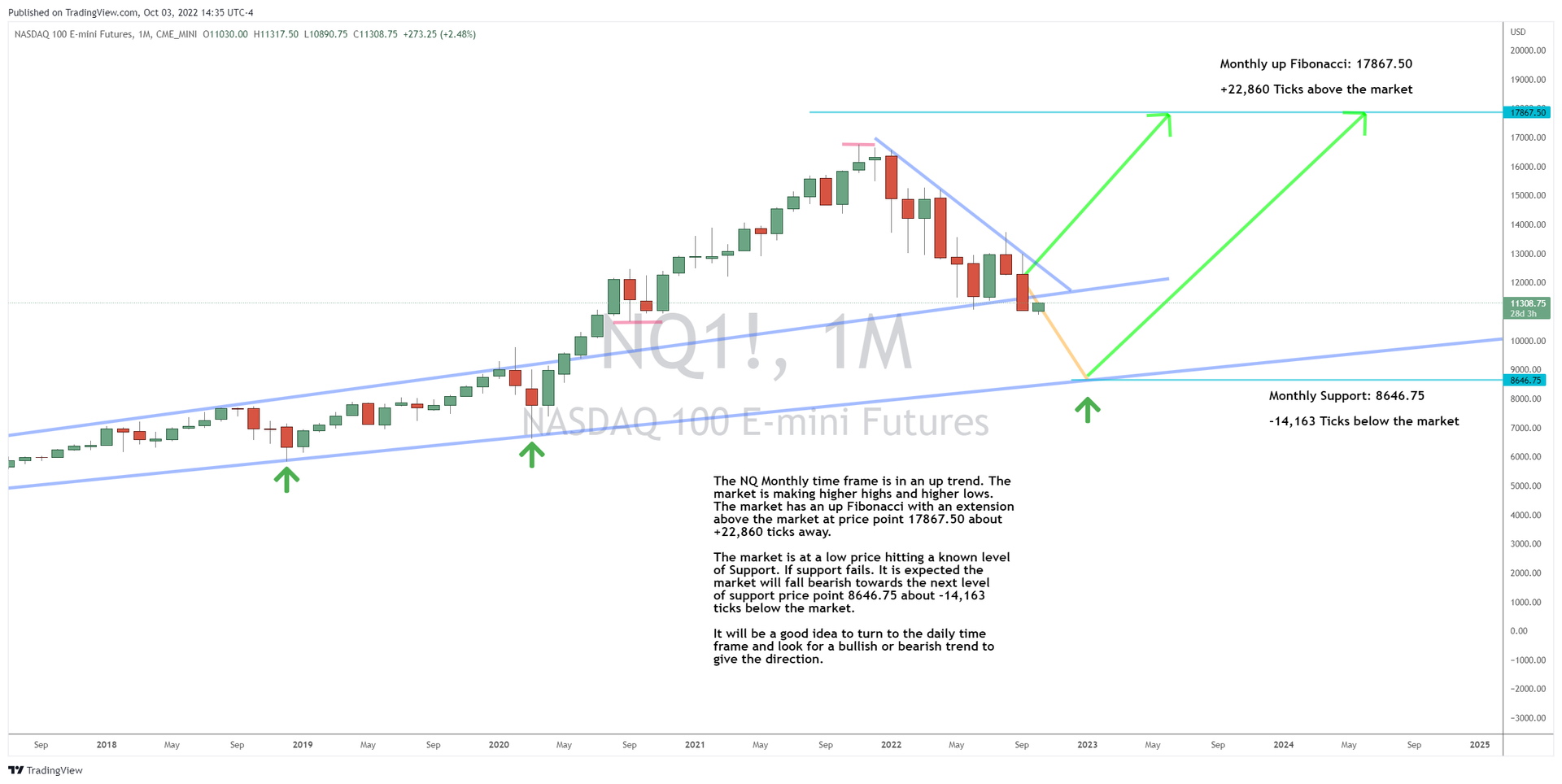 The NQ monthly time frame is in an up trend. The market is making higher highs and higher lows. The market has an up Fibonacci with an extension above the market at price point 17,867.50 about +22,860 ticks away. The market is at a low price hitting a known level of support. If support fails, it is expected the market will fall bearish towards the next level of support price point 8,646.75 about -14,163 ticks below the market. It will be a good idea to turn to the daily time  frame and look for a bullish or bearish trend to give the direction.
